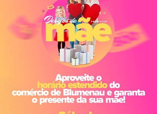 Para que os consumidores possam fazer as compras para o Dias das Mães, a CDL Blumenau está orientando os estabelecimentos associados a ficarem abertos até mais tarde no sábado, dia 12, que antecede a comemoração. Aos sábados a Convenção Coletiva de Trabalho, estabelecida pelo Sindicato dos Empregados no Comércio de Blumenau e o Sindicato do Comércio Varejista de Blumenau (Sindilojas), permite que as lojas permaneçam abertas até as 18h.