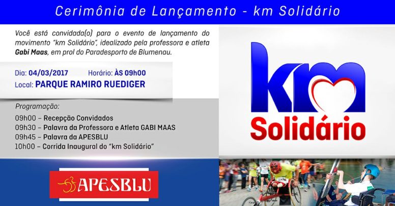 Agora o pessoal do Paradesporto de Blumenau lança uma nova campanha, chamada KM solidário. A professora e atleta Gabriela Mass vai disputar uma maratona internacional (42 mil metros) e pretende que a cada metro percorrido consiga arrecadar recursos para reverter para a associação do Paradesporto de Blumenau. O lançamento será neste sábado, no Parque Ramiro Ruediger.