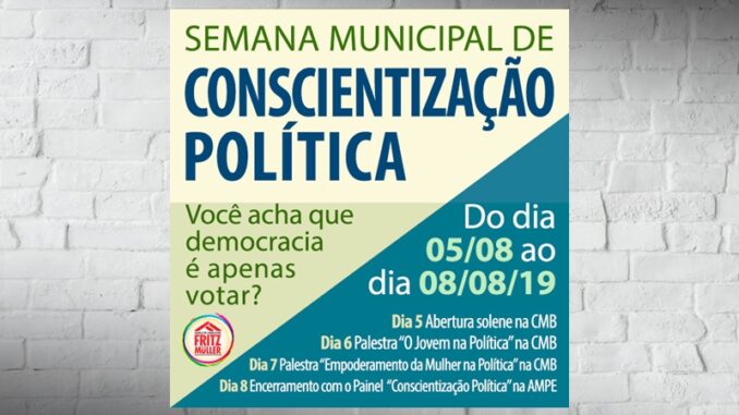 A Câmara de Blumenau promoverá entre os dias 5 a 8 de agosto a “Semana Municipal de Conscientização Política”. A semana está incluída na legislação que trata sobre o calendário oficial de eventos do município.