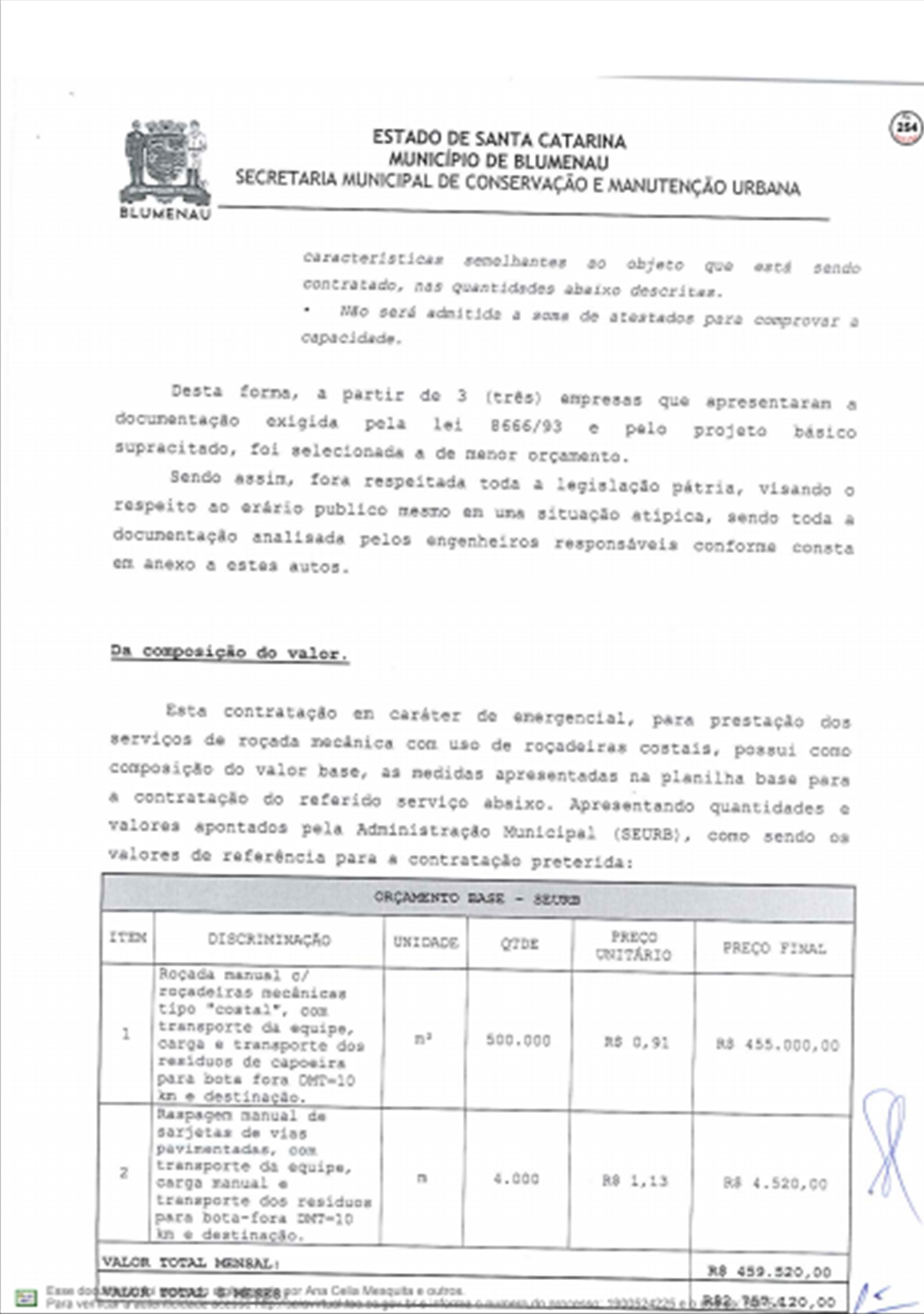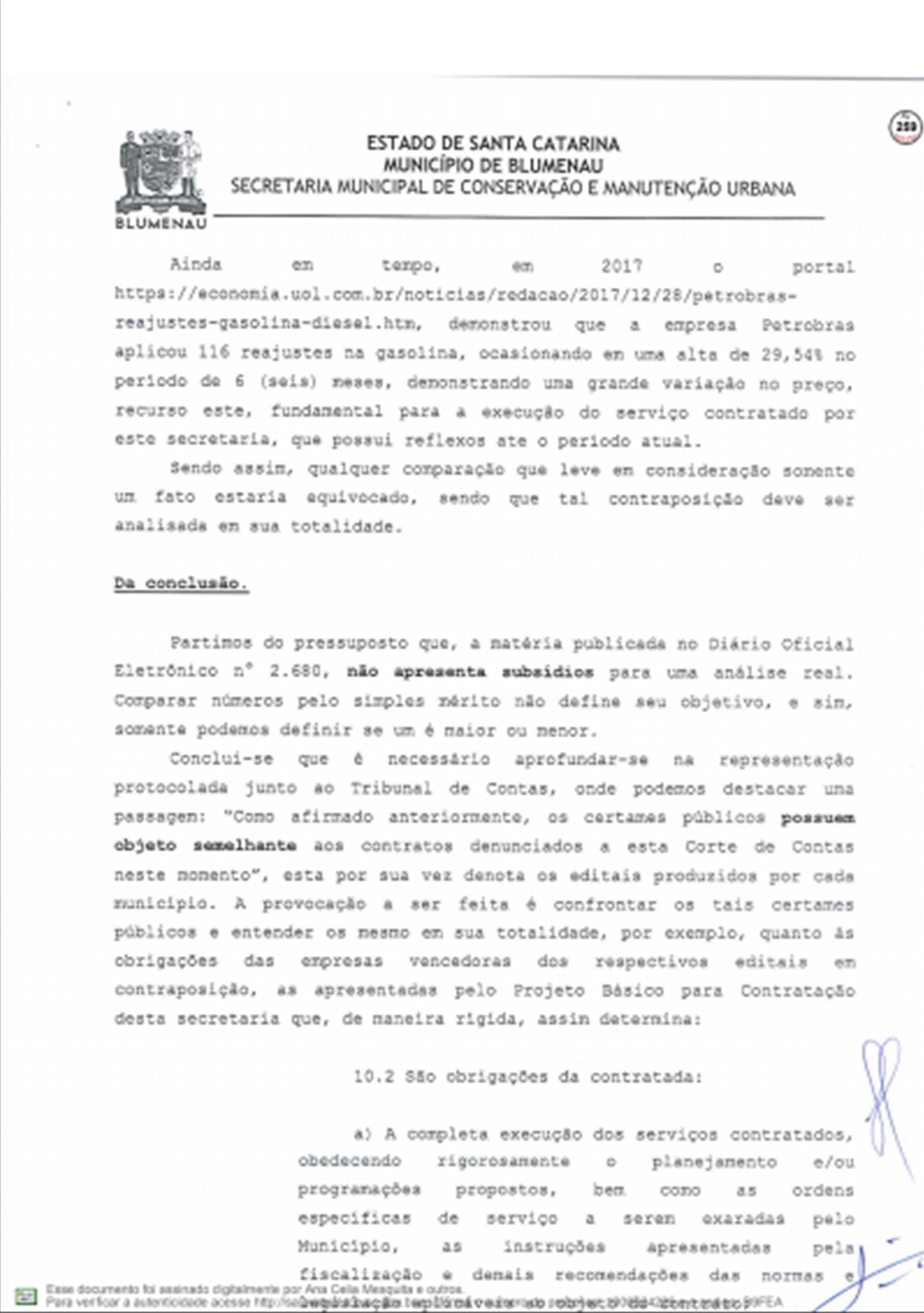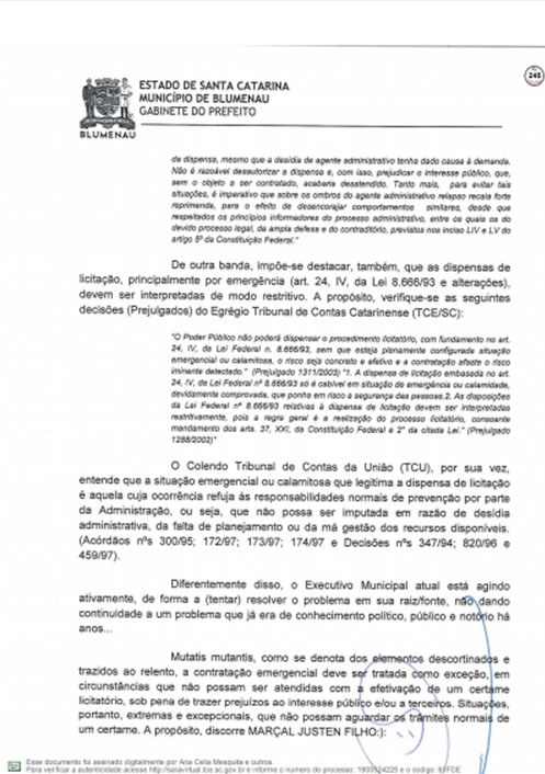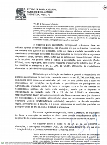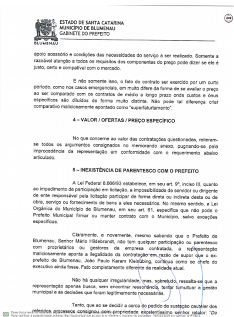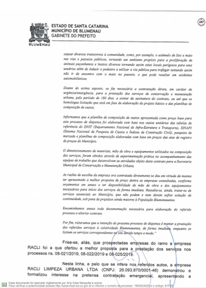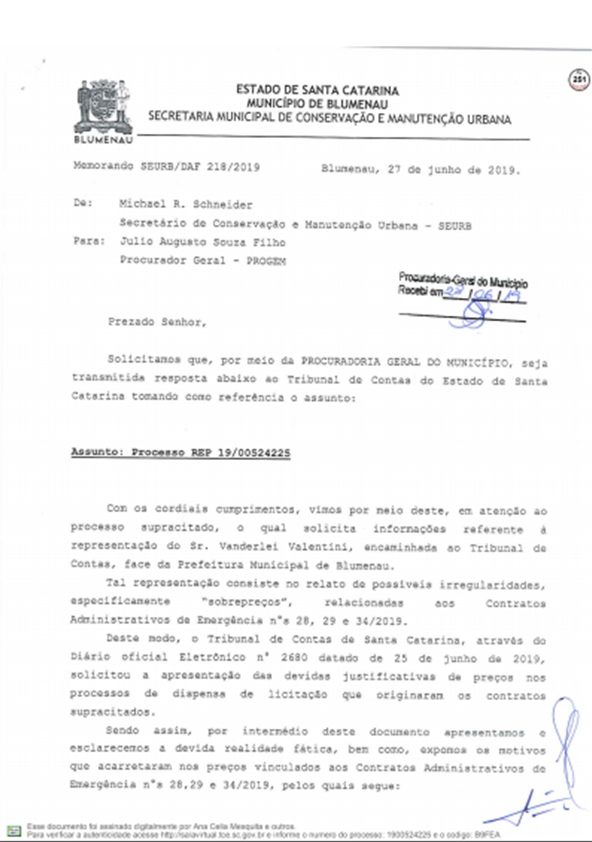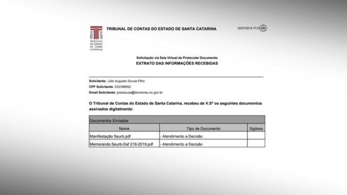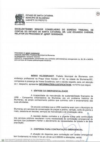 A Prefeitura respondeu ao Tribunal de Contas do Estado sobre as denúncias feitas por Vanderlei Valentini, sobre os contratos emergenciais firmados com a Racli para roçada e outros serviços do tipo, depois da extinção da Companhia Urbanizadora de Blumenau.