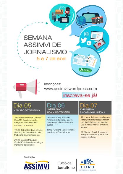 A Semana Assimvi de Jornalismo é uma parceria entre a Associação de Imprensa do Médio Vale do Itajaí (Assimvi) e o curso de Jornalismo da Furb e marcará a passagem do Dia do Jornalista, celebrado em 7 de abril.