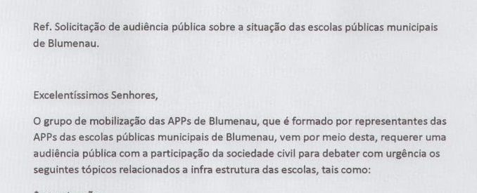 Um grupo de APPs, Associação de Pais e Professores, tem conversado com o vereador, que já apresentou algumas situações que estariam ocorrendo nas unidades. A reclamação é grande, passa por manutenção, reforma nas instalações, falta de material de expediente, entre outros, como é possível ler no texto abaixo.