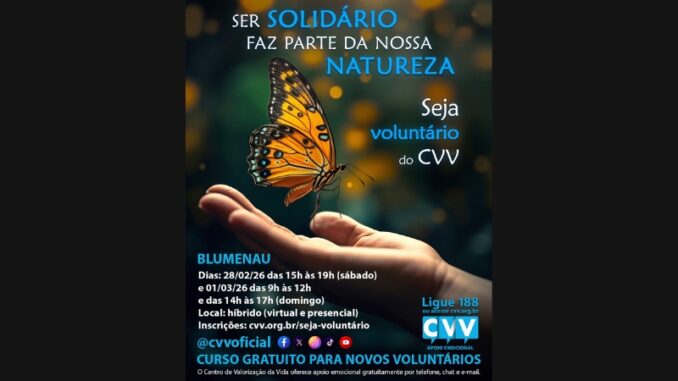 Blumenau sediará, no fim de fevereiro e início de março, um curso gratuito de formação para novos voluntários do Centro de Valorização da Vida (CVV), organização nacional que oferece apoio emocional e atua na prevenção do suicídio por meio de escuta acolhedora, sigilosa e sem julgamentos.