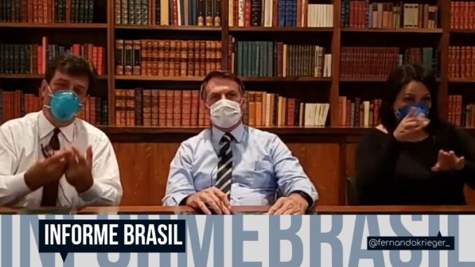 Em sua live semanal, uma hora e meia antes do discurso no rádio e TV, o presidente Bolsonaro ao lado do ministro da Saúde, Luiz Henrique Mandetta, e uma intérprete de Libras, já tinha desencorajado a população a ir às ruas neste domingo e considerou que os atos devem ser adiados “para daqui a um ou dois meses”. Ambos usavam máscaras.