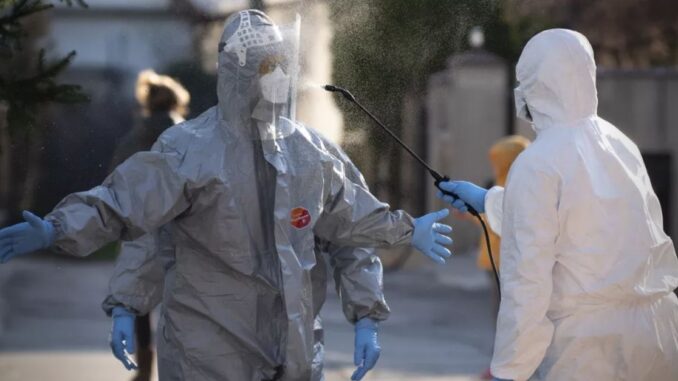 Equipes de emergência em Bratislava, na Eslováquia, desinfectam roupas de proteção contra a Covid-19. Foto: Joe Klamar/AFP