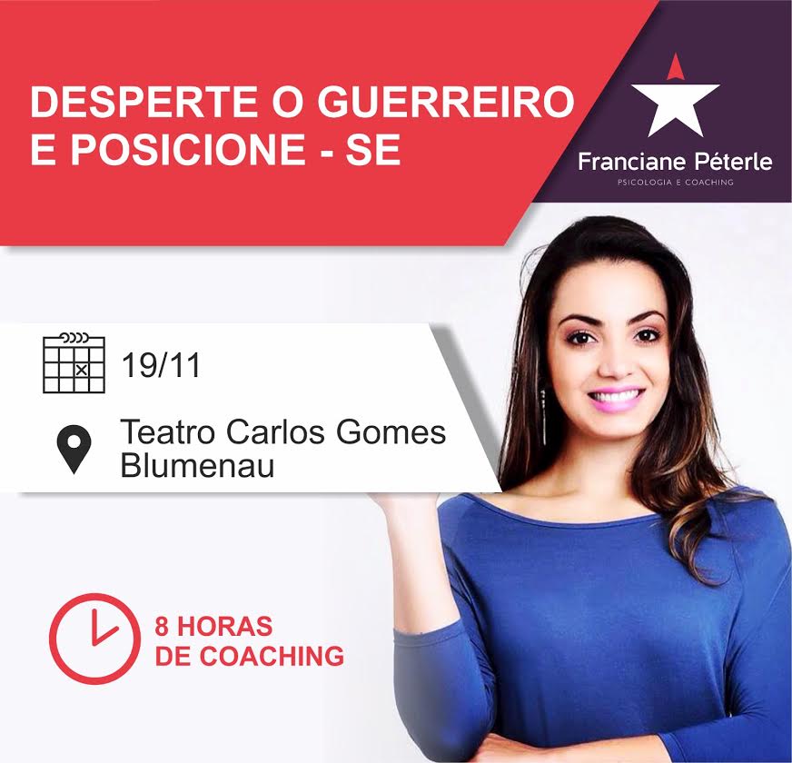 Neste sábado acontece em Blumenau um workshop chamado Desperte o Guerreiro e Posicione-se, que alia psicologia e técnicas de coaching. Mais informações no release enviado pela jornalista Karin Bendheim. Franciane Péterle realiza wokshop em Blumenau […]