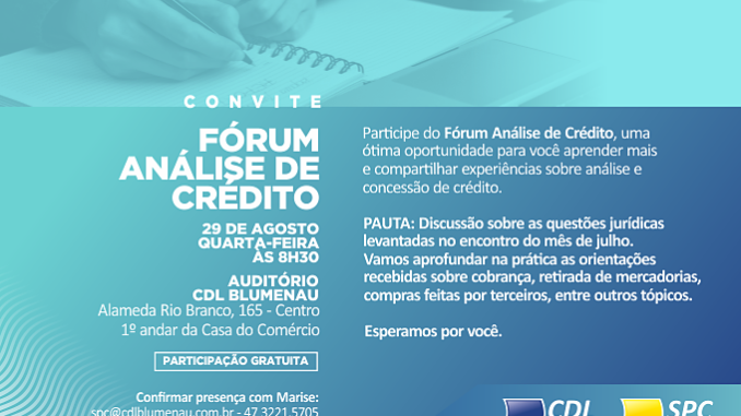 Na próxima quarta-feira, dia 29, a CDL Blumenau realizará mais um encontro do Fórum Análise de Crédito, que tem como objetivo principal discutir assuntos, produtos e serviços com relação à análise e concessão de crédito. A ação inicia às 8h20, no auditório da CDL Blumenau (Alameda Rio Branco, 165).