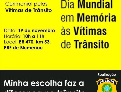 Organizado pela PRF, a cerimônia para refletir sobre o Dia Mundial em Memória às Vítimas de Acidente de Trânsito, que iria acontecer no domingo, 19, será realizada nesta sexta-feira, 10h, no KM 53 da BR 470, junto ao posto da Policia Rodoviária Federal.