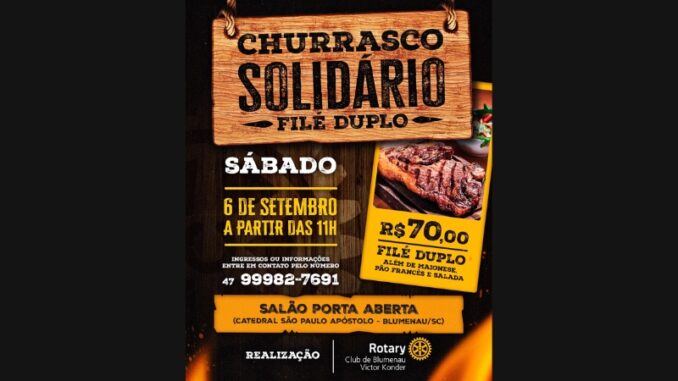 O Rotary Club de Blumenau Victor Konder promove no dia 6 de setembro, a partir das 11h, o Churrasco Solidário. O evento será realizado no Salão Porta Aberta da Catedral São Paulo Apóstolo e tem como objetivo arrecadar recursos para apoiar projetos sociais que beneficiam a comunidade.