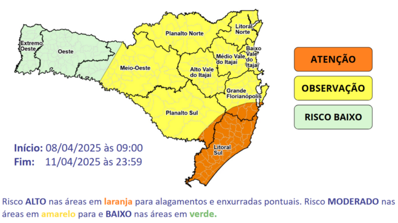 Santa Catarina enfrenta dias instabilidade, especialmente no Litoral e áreas próximas, com períodos de chuva frequente. Segundo o Centro de Monitoramento da Proteção e Defesa Civil, sistemas de baixa pressão manterão o tempo chuvoso, aumentando os riscos de alagamentos e enxurradas no Meio-Oeste, Vale do Itajaí e, principalmente, nas áreas litorâneas.