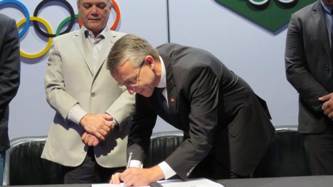 O Prefeito de Blumenau, Mário Hildebrandt, assinou nesta terça-feira, 09, o documento que reconhece Blumenau como cidade sede dos Jogos Escolares da Juventude. A assinatura aconteceu na sede do Comitê Olímpico Brasileiro (COB) no Rio de Janeiro e contou com a participação do Secretário de Turismo, Marcelo Greuel, o Presidente da Fundação Municipal de Desporto, Egídio Beckhauser e o presidente da Fesporte, Rui Godinho (PSL).