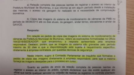 O presidente Fábio Fiedler (PSD) e o relator Jefferson Forest (PT) não gostaram nada da resposta da secretaria municipal de Administração em relação ao pedido de imagens solicitadas pela comissão. Quase um mês depois, o secretário Anderson Rosa respondeu ” que as imagens deveriam ser solicitadas à empresa responsável pelas câmeras, onde ficam armazenadas pelo período de 30 dias “. Com esta posição o CPI analisará se convocará o secretário ” para explicar a recusa em fornecer as imagens e a demora em responder ao requerimento, o que pode ter ocasionado o descarte das imagens do período requerido, que é anterior à denúncia que deu origem à CPI”.