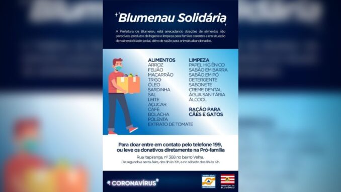 Desde o dia 28 de março a Prefeitura de Blumenau, por meio da secretaria de Defesa Civil (Sedeci), realiza a campanha Blumenau Solidária, para arrecadação de alimentos não perecíveis, produtos de higiene e limpeza para famílias carentes e em situação de vulnerabilidade social, e ração para animais abandonados e famílias de baixa renda que tenham animais de estimação.