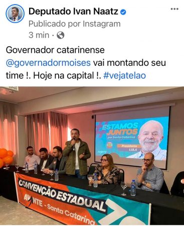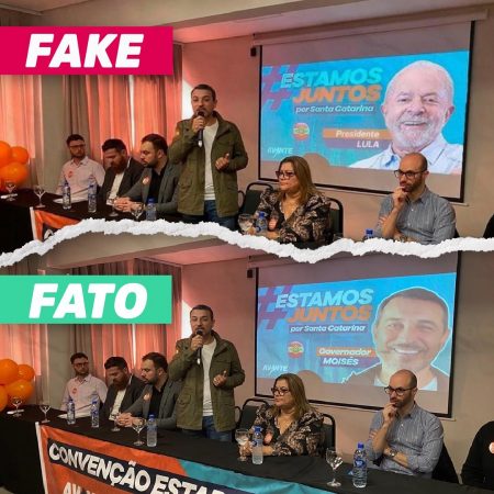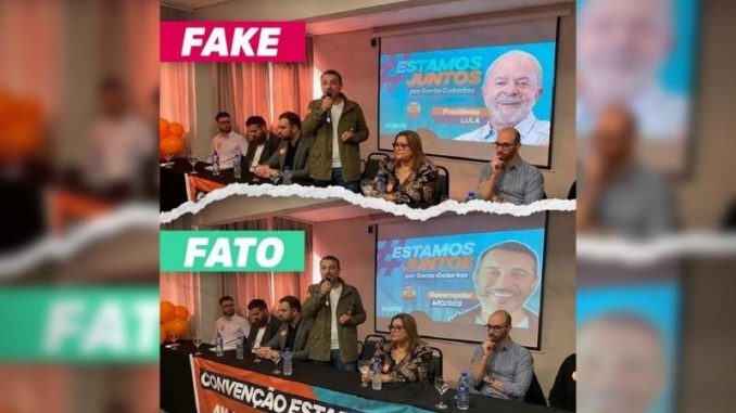 Mas as redes sociais são terras férteis também. O deputado estadual Ivan Naatz , líder do PL na Assembleia Legislativa, usou suas redes para propagar uma fake news contra o governador Carlos Moisés (Republicanos), usando uma montagem falsa da presença do governador na convenção do Avante, com uma foto do apoio ao presidente Lula (PT), o que não existiu.