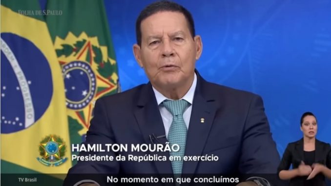 O vice-presidente, Hamilton Mourão, criticou em pronunciamento em rede nacional nesta sábado (31) representantes dos Três Poderes e afirmou que o silêncio de autoridades criou o caos social.