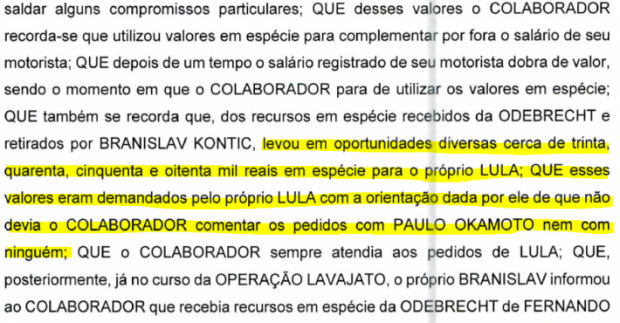 No depoimento de abril do ano passado, Palocci afirmou ter repassado ’em oportunidades diversas’ cerca de R$ 30 mil, R$ 40 mil, R$ 50 mil e R$ 80 mil em espécie para o próprio Lula.