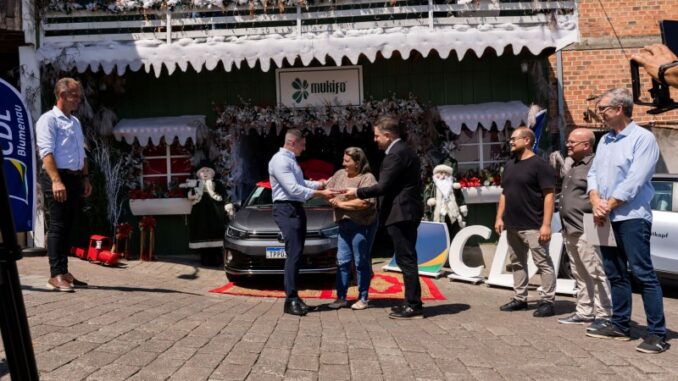 A manhã desta quinta-feira, 8 de janeiro, foi marcada por muita emoção e alegria em Blumenau. A CDL Blumenau realizou a entrega do principal prêmio da promoção Magia de Natal — um Volkswagen Virtus Comfortline zero-quilômetro — à grande ganhadora, Clecilda Neckel Dartora da Silva. A consumidora garantiu sua participação na campanha ao realizar compras na Mukifo Decorações, uma das empresas participantes da ação.