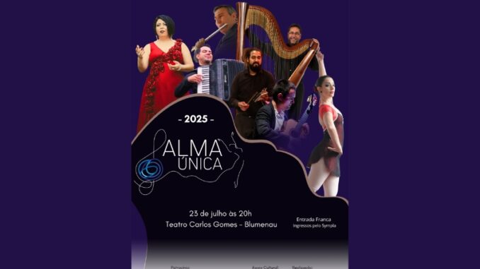 A cidade de Blumenau recebe, no dia 23 de julho (quarta-feira), às 20h, o espetáculo “Alma Única”, no palco do Teatro Carlos Gomes (Rua XV de Novembro, 1181 – Centro). A apresentação é gratuita e tem Classificação Livre, oferecendo ao público uma experiência sensorial única que combina música de câmara, canto lírico, dança clássica e elementos da música popular brasileira e latina.