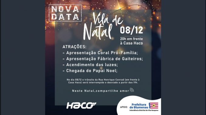 A 1ª edição do evento “Vila de Natal” que aconteceria nesta quinta-feira, dia 01 de dezembro, foi transferida para o dia 08 de dezembro, também às 20h. A decisão foi tomada devido à previsão de chuva apontada pelo Alertablu, vinculado à Defesa Civil da Prefeitura de Blumenau. De acordo com a organização do evento, a programação acontece defronte a “Casa Haco”, na Rua Henrique Conrad, na Vila Itoupava.