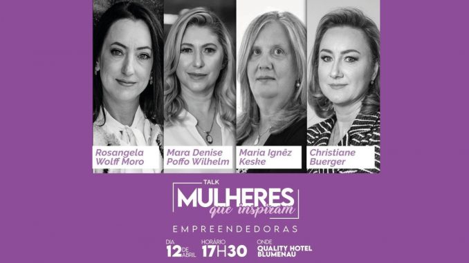 Neste dia 12 de abril, ocorre em Blumenau um evento dedicado ao empreendedorismo e networking feminino. É o talk Inspire-se, que marca o encerramento da segunda edição do projeto Mulheres que Inspiram, alusivo a uma homenagem realizada durante o mês de março para as mulheres e contará com a presença da advogada Rosangela Wolff Moro; Mara Denise Poffo Wilhelm, advogada e representante da Contax Contabilidade e Planejamento Tributário, Maria Ignêz Keske, sócia e proprietária da WK Sistemas, Christiane Buerger vice-presidente da Associação Empresarial de Blumenau (Acib) e sócia-proprietária da Ártico, Cristiane Soethe Zimmermann, jornalista e sócia-proprietária da Presse Comunicação Empresarial.