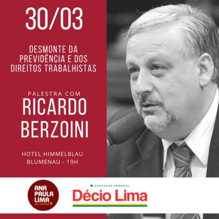 Ricardo Berzoini foi o primeiro ministro da Previdência Social dos governos do PT, em 2003, com Luis Inácio Lula da Silva. Este é o tema que o traz a Blumenau nesta quinta-feira, 30. Falará sobre “o desmonte da previdência e dos direitos trabalhistas”, como diz a assessoria dos deputado federal Décio Lima e da deputada Ana Paula Lima (ambos do PT), responsáveis por sua vinda à cidade.