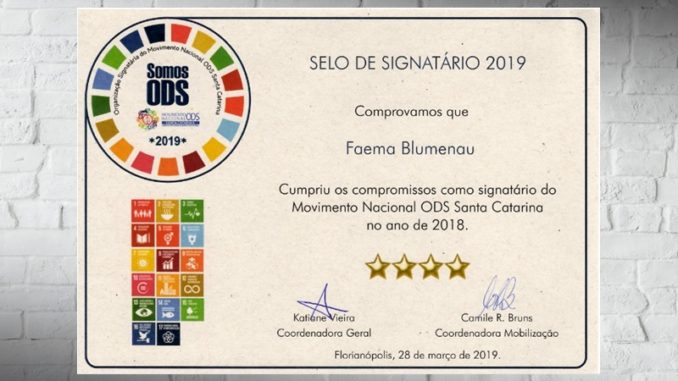A Fundação Municipal do Meio Ambiente (Faema) recebeu na última semana o Selo de Signatário 2019 do Movimento Nacional ODS Santa Catarina. A certificação foi dada à autarquia durante a assembleia estadual realizada no auditório do campus da Univali, em São José.