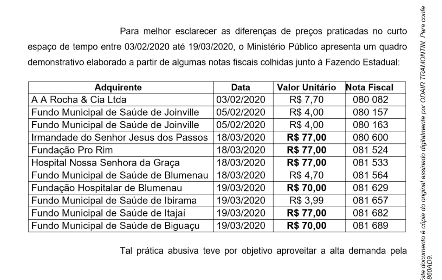 Conforme pode ser comprovado pelo quadro nesta página, extraído da denúncia apresentada pelo Promotor de Justiça Odair Tramontin, a empresa, em fevereiro, fornecia máscaras cirúrgicas a preços que variavam em torno de quatro a cinco reais, aproximadamente, por pacote de 50 unidades.