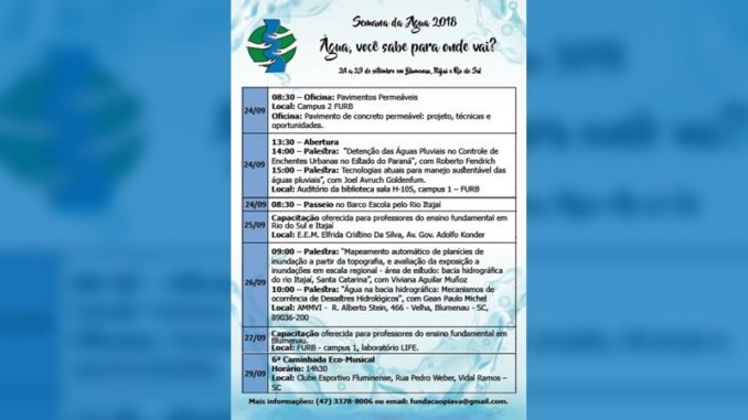 Entre os dias 24 a 29 de setembro acontece a Semana da Água, uma campanha educativa e de cidadania desenvolvida desde 1999 pelo Comitê do Itajaí. As ações serão realizadas nas cidades de Blumenau, Itajaí e Rio do Sul. Este ano o tema será: “Água, você sabe para onde vai?”, destacando a importância do armazenamento de águas na Bacia do Itajaí em três diferentes escalas: armazenamento em nível da Bacia Hidrográfica e armazenamento urbano em nível municipal. Para tanto, serão abordados os seguintes temas: Armazenamento de água em planícies de inundação e Gerenciamento de água pluvial urbana.