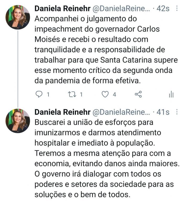 Pelas redes sociais, a vice governadora Daniela Reinerh (sem partido) se manifestou após a decisão do Tribunal Especial de Julgamento da Assembleia Legislativa de acatar a denúncia contra o governador Carlos Moisés (PSL) por crime de responsabilidade no caso da compra de 200 respiradores.