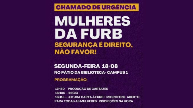 Nesta segunda-feira (18), às 18h, em frente à Biblioteca Universitária, um grupo de mulheres da comunidade acadêmica da Universidade Regional de Blumenau (FURB) promoverá um ato público com foco na segurança dentro do campus.