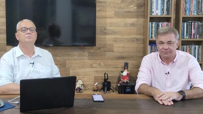 O jornalista Alexandre Gonçalves conversa com o prefeito de Florianópolis, Gean Loureiro, do União Brasil, pré-candidato ao Governo de SC.
