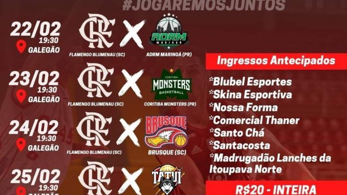 A partir desta segunda-feira, dia 14, inicia a venda de ingressos antecipados para os jogos do Flamengo Blumenau no Campeonato Brasileiro de Basquete. A primeira partida em casa será no dia 22 de fevereiro, contra o ADRM Maringá (PR), às 19h30, no Ginásio do Galegão.