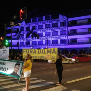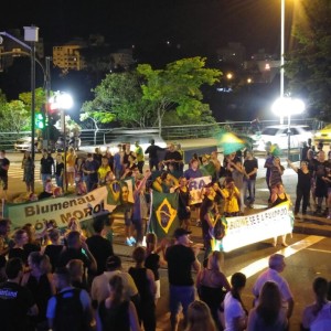 As manifestações contra a corrupção e pedindo a saída da presidente Dilma Rousseff continuam em Blumenau. Na noite desta quinta-feira, dia da posse de Lula como ministro-chefe da Casa Civil, os manifestantes estiveram em frente à prefeitura. A maioria se concentrou nas calçadas. Com som alto, apitos, faixas, bandeiras e muita energia, interagiam com os carros que passavam – a maioria destes reagia com buzinaços. O Pixuleco (restaurado depois do incidente de ontem) também foi enchido no local.