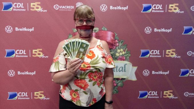 Há pessoas que a gente quer ficar bem pertinho para ver se pega um pouco da sorte, não é mesmo?! Assim é com a Maria Elena Rodrigues Tonn, que ganhou R$ 500 em vales-compras no quinto sorteio da promoção Magia de Natal 2021 da CDL Blumenau. Esse foi apenas um dos prêmios que ela conquistou.