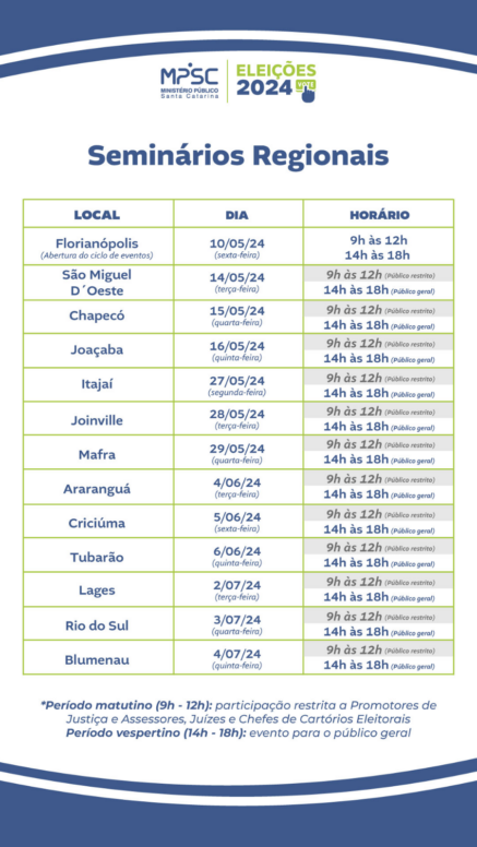 O ciclo de seminários começa com um evento de abertura em Florianópolis e mais 12 eventos que ocorrerão, entre os meses de maio e julho, nas diversas regiões do Estado. O primeiro acontece em Florianópolis em 10 de maio. Depois, será a vez de São Miguel do Oeste, Chapecó, Joaçaba, Itajaí, Joinville, Mafra, Araranguá, Criciúma, Tubarão, Lages, Rio do Sul e Blumenau (veja o calendário abaixo).