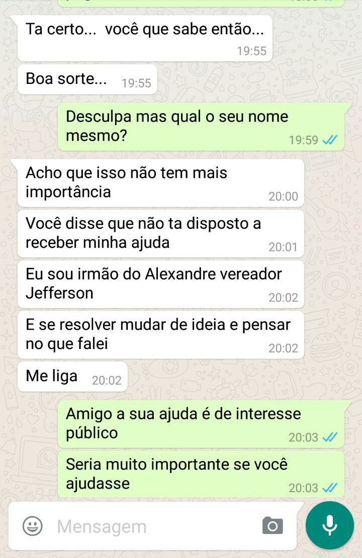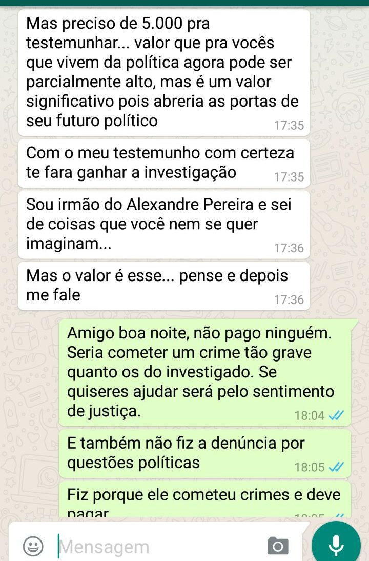 Um deles teria usado o celular do outro para mandar mensagens via whatsApp para o relator Jefferson Forest (PT), solicitando dinheiro para dar um testemunho que “faria você ganhar esta investigação e o julgamento”. Na mensagem também está escrito ” sou irmão do Alexandre Pereira e sei de coisas que vocês nem imaginam”.