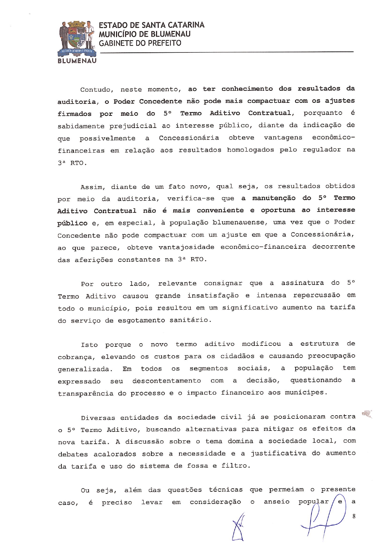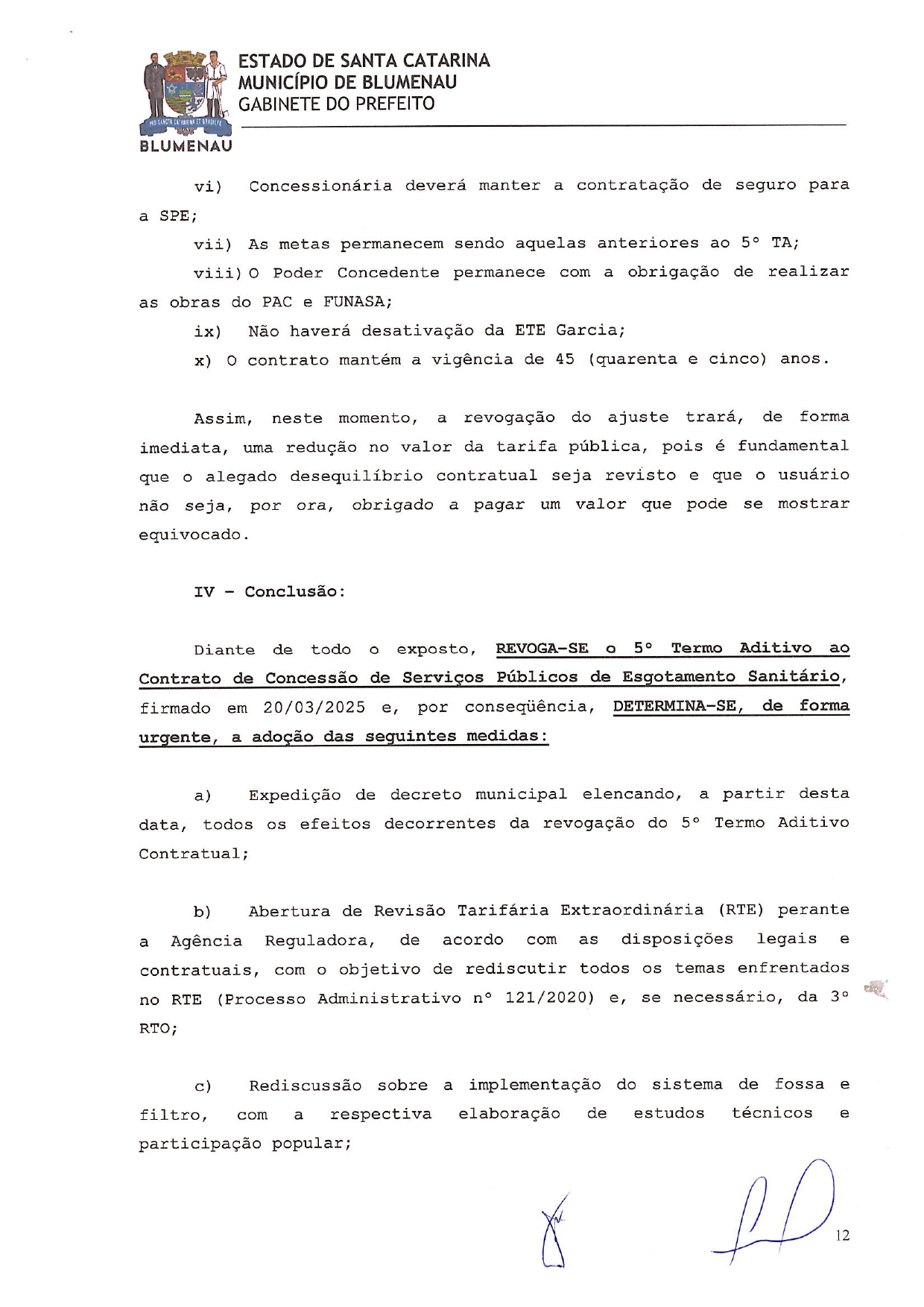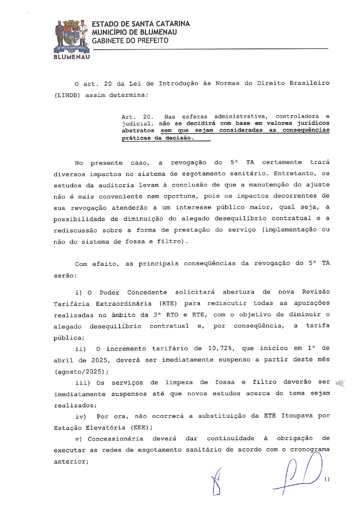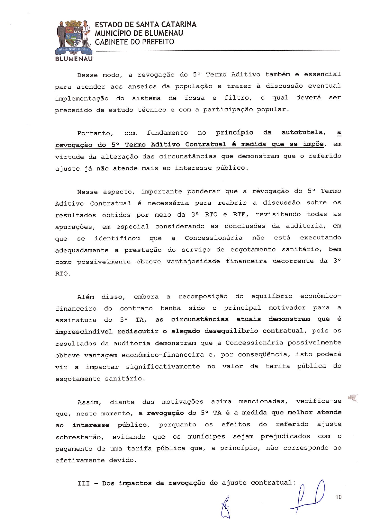 Os argumentos que embasam a decisão do prefeito Egidio Ferrari (PL) de revogar o 5º aditivo do contrato do serviço de esgoto em Blumenau, assinado por ele em março, estão em 13 folhas de um documento oficial, onde busca-se contextualizar os motivos da assinatura do termo que provocou um reajuste extra na tarifa de 10,72% e a mudança no sistema de coleta, passando a ser 40% através de caminhão limpa fossa.