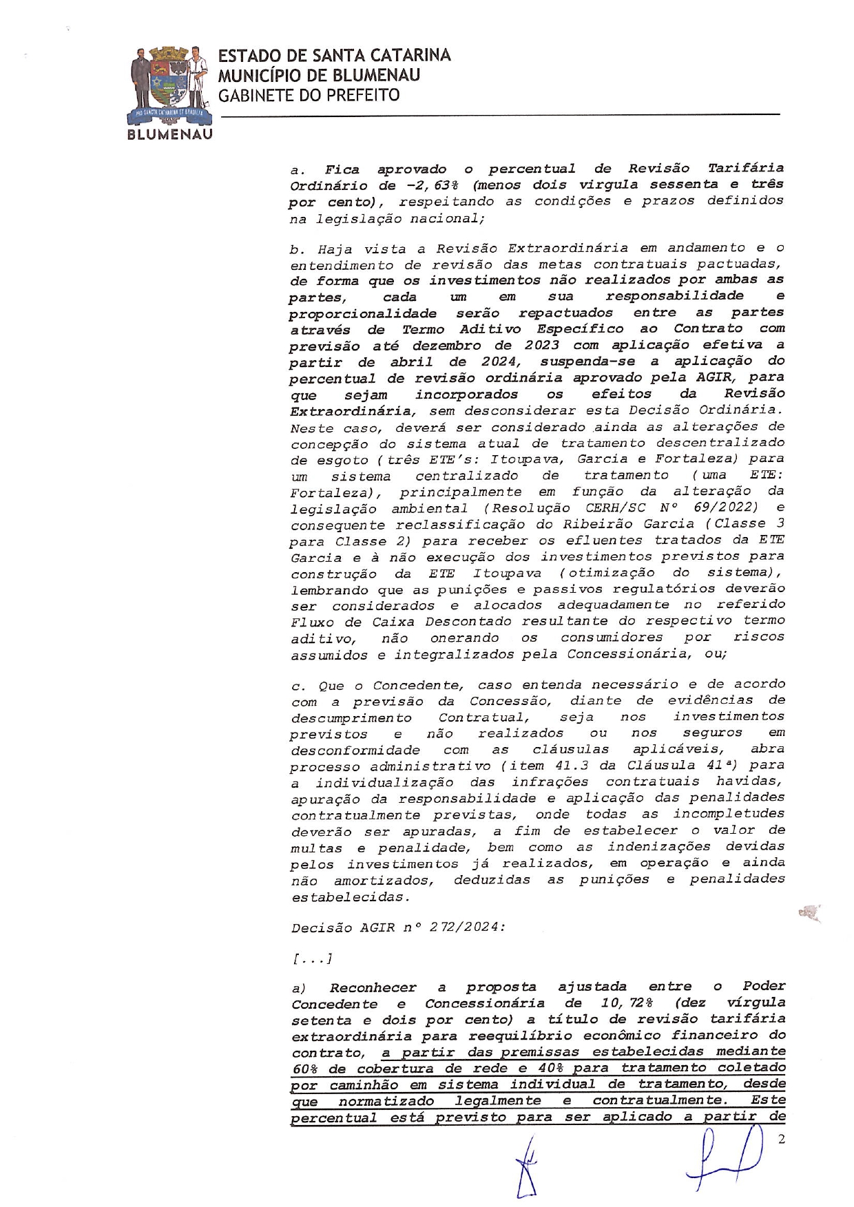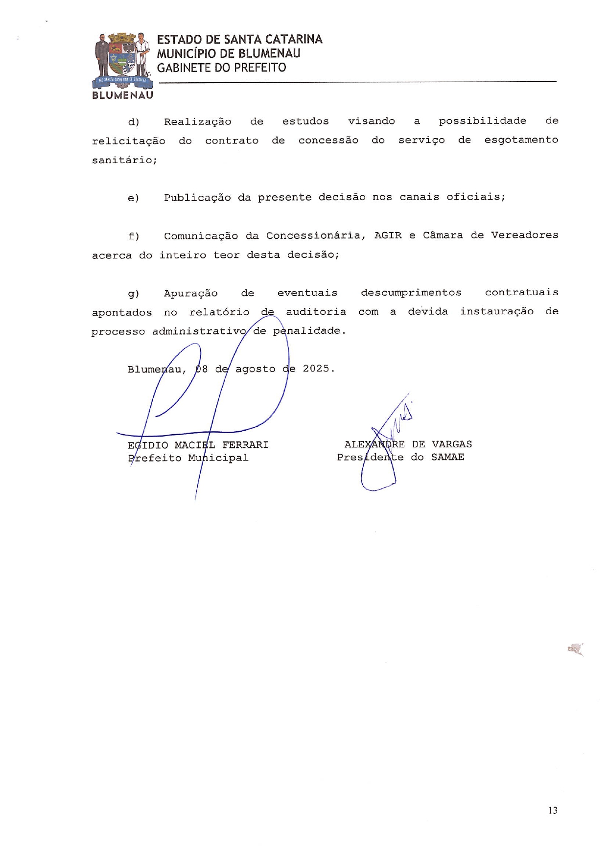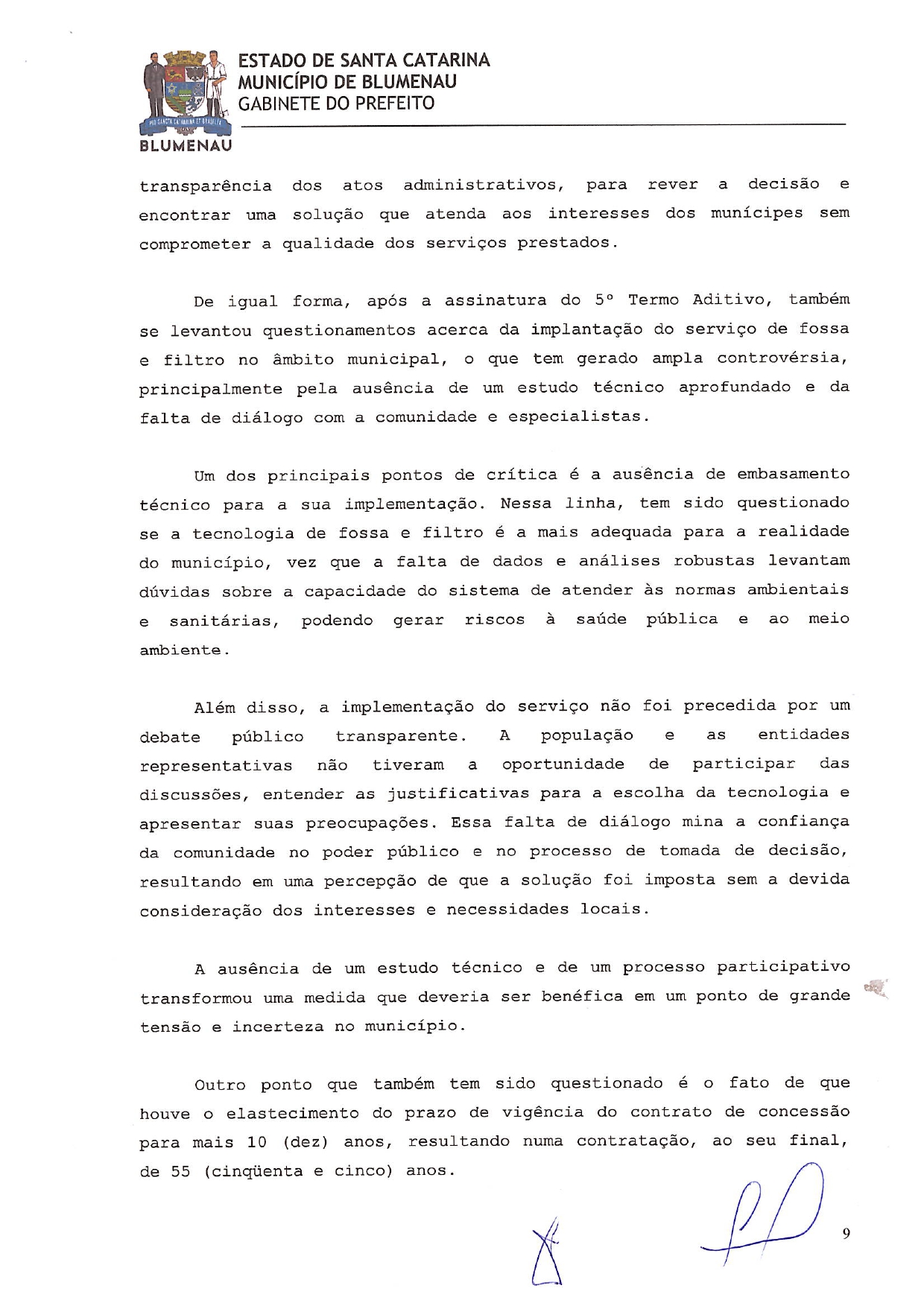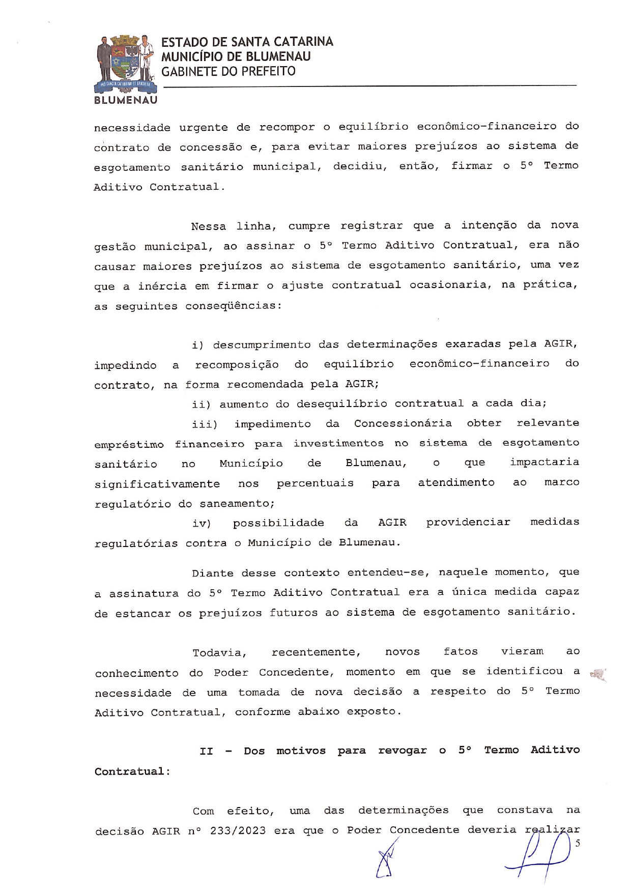 Os argumentos que embasam a decisão do prefeito Egidio Ferrari (PL) de revogar o 5º aditivo do contrato do serviço de esgoto em Blumenau, assinado por ele em março, estão em 13 folhas de um documento oficial, onde busca-se contextualizar os motivos da assinatura do termo que provocou um reajuste extra na tarifa de 10,72% e a mudança no sistema de coleta, passando a ser 40% através de caminhão limpa fossa.