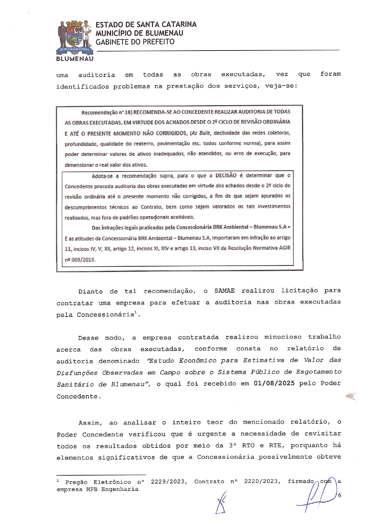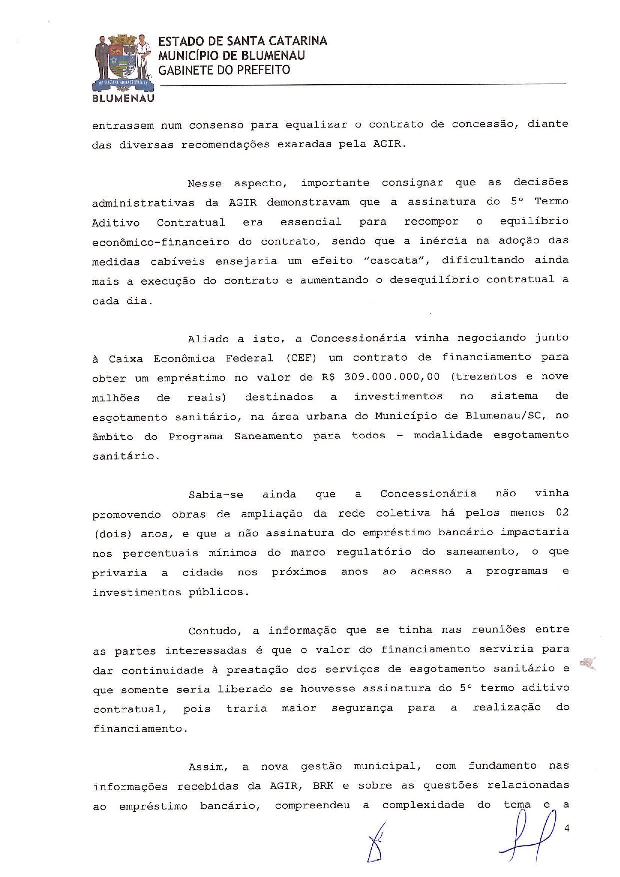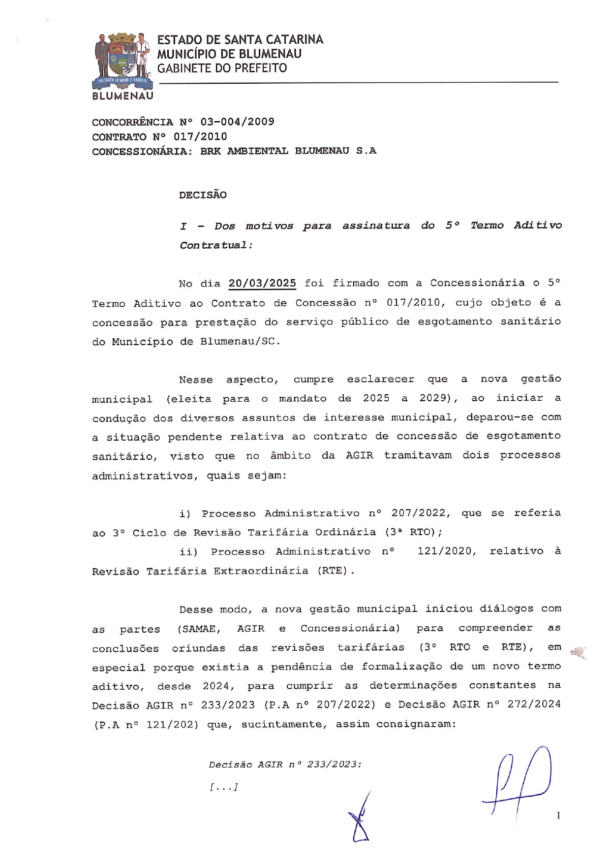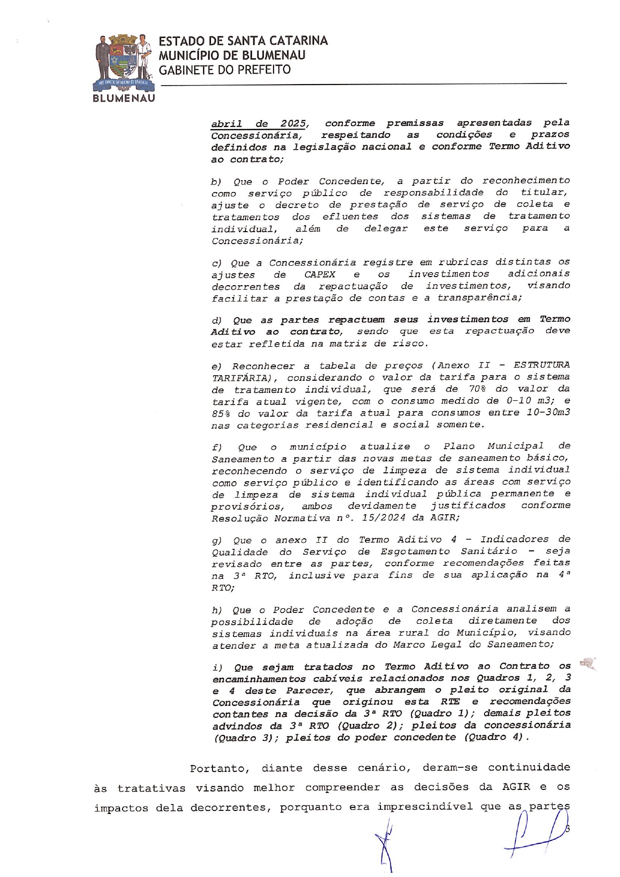 Os argumentos que embasam a decisão do prefeito Egidio Ferrari (PL) de revogar o 5º aditivo do contrato do serviço de esgoto em Blumenau, assinado por ele em março, estão em 13 folhas de um documento oficial, onde busca-se contextualizar os motivos da assinatura do termo que provocou um reajuste extra na tarifa de 10,72% e a mudança no sistema de coleta, passando a ser 40% através de caminhão limpa fossa.