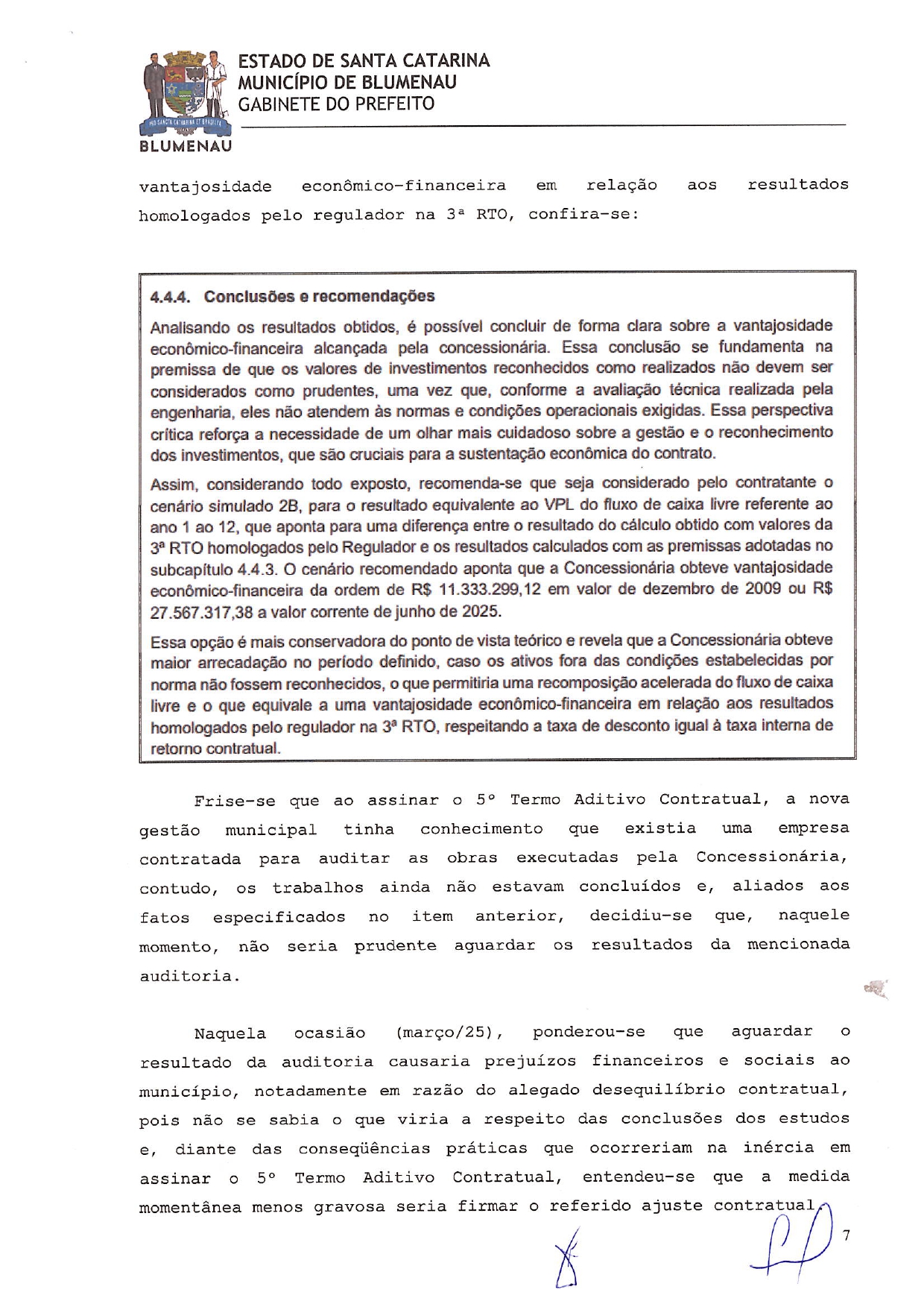 “Naquela ocasião, ponderou-se (março/2025) que aguardar o resultado da auditoria causaria prejuízos financeiros e sociais ao município, notadamente em razão do alegado desequilíbrio financeiro, pois não se sabia o que viria a respeito das conclusões dos estudos, e, diante das consequências práticas que ocorreriam na inércia em assinar o 5º aditivo, entendeu-se que a medida momentânea menos gravosa seria assinar o referido ajuste contratual”, indica a nota.