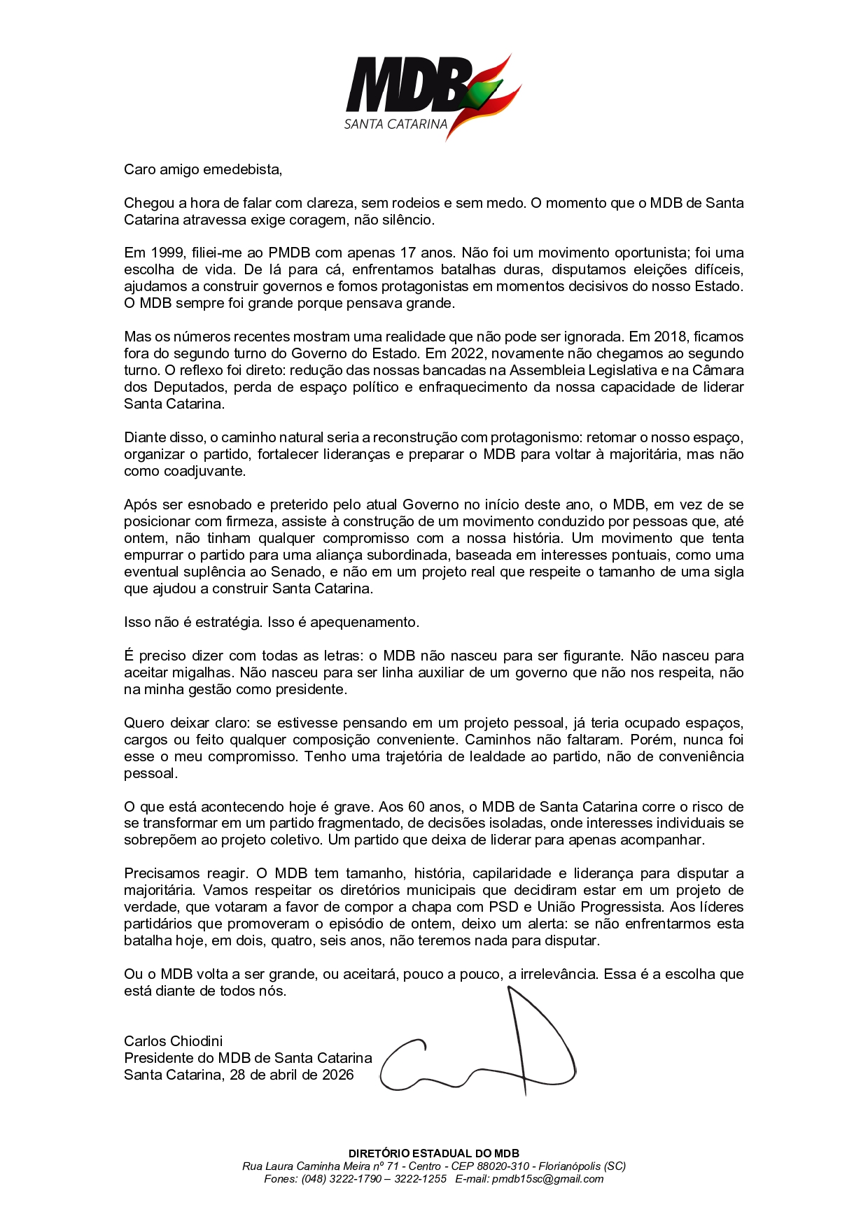 “Após ser esnobado e preterido pelo atual governo no início deste ano, o MDB, em vez de se posicionar com firmeza, assiste à construção de um movimento conduzido por pessoas que, até ontem, não tinham qualquer compromisso com a nossa história. Um movimento que tenta empurrar o partido para uma aliança subordinada, baseada em interesses pontuais, como uma eventual suplência ao Senado, e não em um projeto real que respeite o tamanho de uma sigla que ajudou a construir Santa Catarina. Isso não é estratégia. Isso é apequenamento”, escreveu, lembrando que a sigla estava embarcada no projeto de reeleição, mas foi abandonada pelo governador, que optou por Adriano Silva (Novo), ex-prefeito de Joinville.