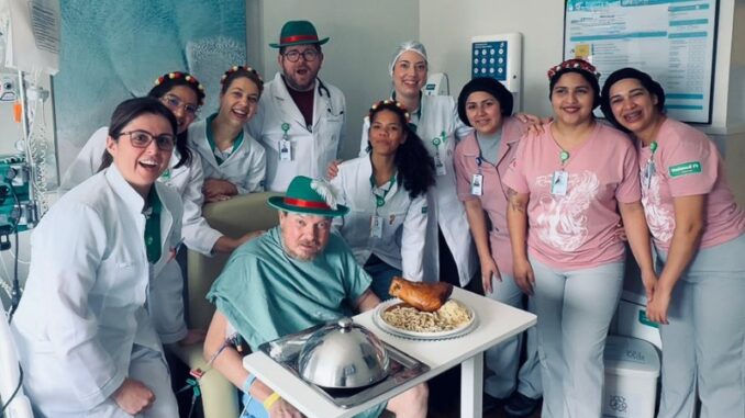 Sabendo o quanto ele é fã da Oktoberfest Blumenau e da culinária típica alemã, as equipes assistencial e de nutrição se uniram para preparar uma surpresa especial: o paciente pôde saborear um tradicional Eisbein (joelho de porco) — prato símbolo da gastronomia germânica, servido no restaurante Norden, que ele costumava frequentar.