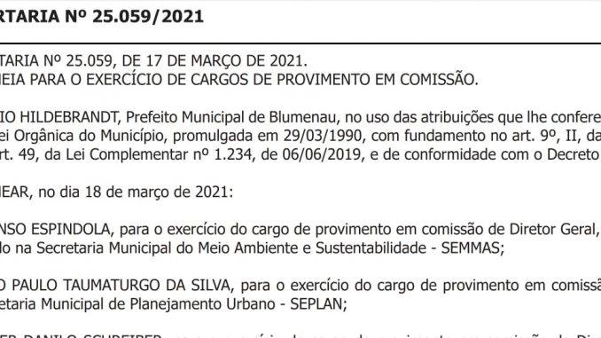Na semana que passou, dois suplentes de vereador se transformaram diretores na Prefeitura de Blumenau. Afonso Espíndola, será diretor geral da Secretaria Municipal do Meio Ambiente e Sustentabilidade e João Paulo Taumaturgo ocupará a diretoria geral da Secretaria Municipal de Planejamento Urbano.