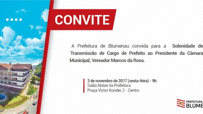 Como o Informe Blumenau anunciou, o presidente da Câmara de Vereadores de Blumenau, Marcos da Rosa (DEM),  assumirá a Prefeitura. Hoje definiu-se a data. Será no dia 3 de agosto, próxima sexta-feira. A cerimônia de transmissão de cargo pelo prefeito Napoleão Bernardes (PSDB) será às 9 horas, no salão nobre da Prefeitura.