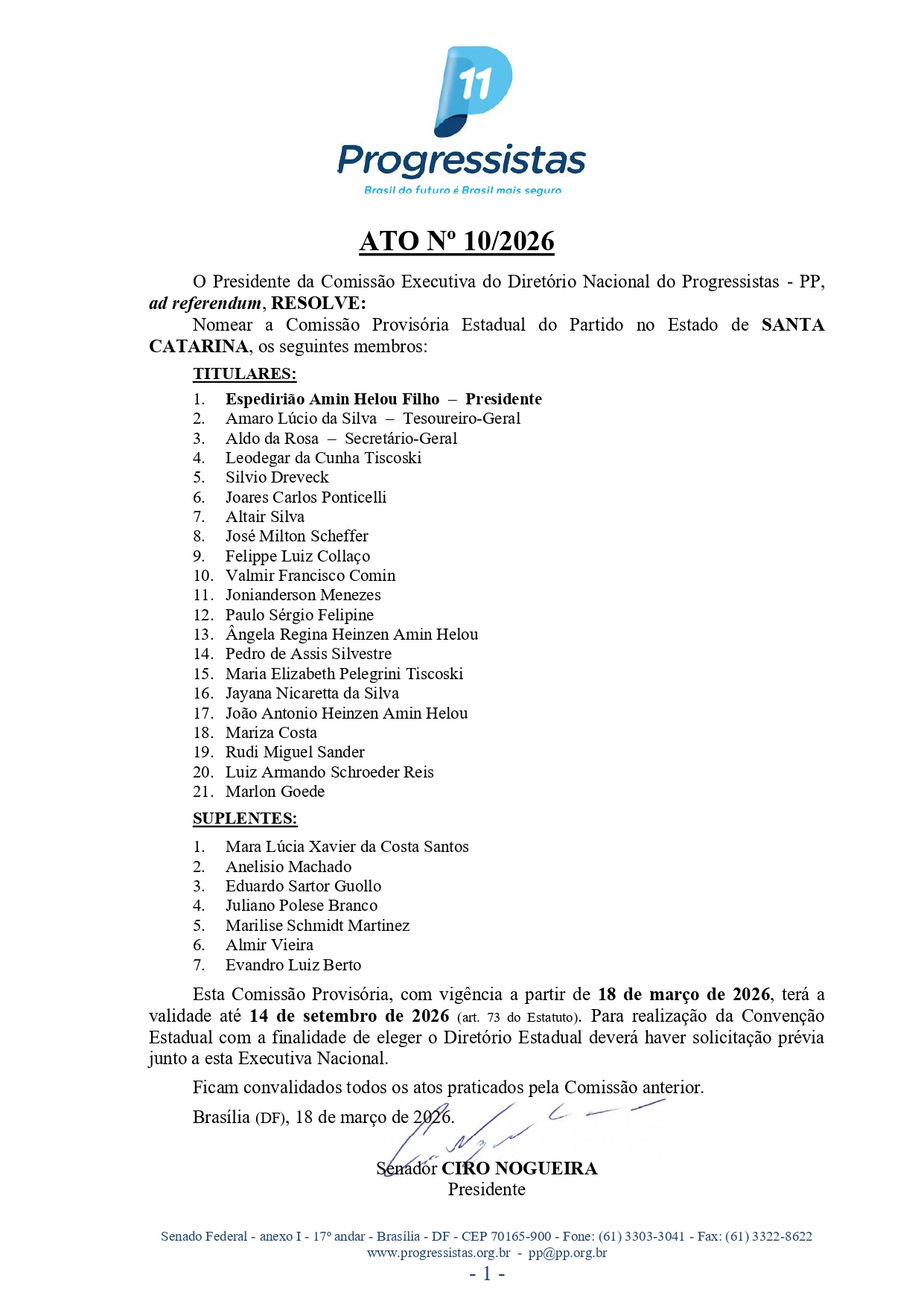 O senador Esperidião Amin (PP) tem mesmo prestígio em Brasília. Em documento assinado nesta manhã pelo presidente nacional da sigla, Ciro Nogueira, foi nomeada uma nova Comissão Provisória Estadual do partido no estado, com o senador Amin como presidente.