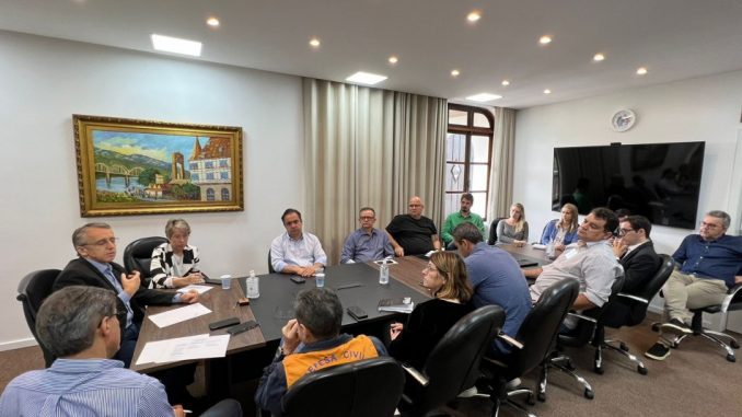 O prefeito Mário Hildebrandt e a vice-prefeita Maria Regina de Souza Soar reuniram, na manhã desta segunda-feira, dia 10, parte do colegiado para discutir os próximos passos na decisão sobre as medidas de segurança na rede municipal de ensino. A Prefeitura está viabilizando, via Procuradoria Geral e Secretaria de Administração, a contratação de vigilância armada para as unidades municipais de ensino.