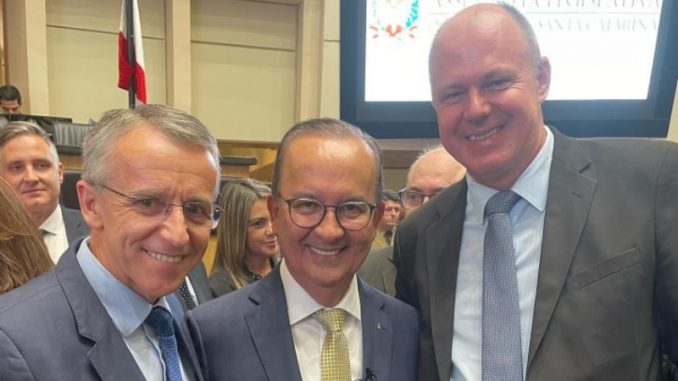 Entre os políticos presentes na solenidade de posse do governador Jorginho Mello (PL) estava o prefeito de Blumenau, Mário Hildebrandt (Podemos). Ele tirou foto com o novo mandatário, ao lado do prefeito de Pomerode, Ércio Kriek (União).