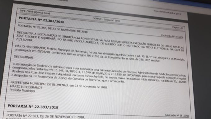 Foi publicado no Diário Oficial de Blumenau da última quinta-feira, 29, a abertura de uma sindicância interna para apurar a “suposta execução irregular de obras nas ruas José Fischer e Aquidabã, no bairro Escola Agrícola.” As obras são alvo de um procedimento para investigar indícios de irregularidades e tráfico de influência.