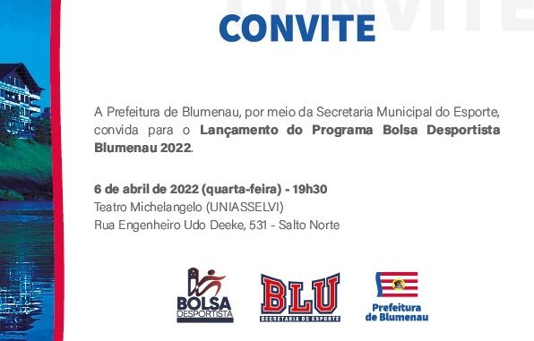 A Prefeitura de Blumenau, por meio da Secretaria do Esporte (SME) irá lançar nesta quarta-feira, dia 06, às 19h30, no Teatro Michelangelo, o programa Bolsa Desportista 2022. A cerimônia contará com a presença do prefeito Mário Hildebrandt, da vice-prefeita Maria Regina Soar, do secretário do Esporte Ricardo Arty Echelmeier e demais convidados. O objetivo do programa é apoiar através de beneficio financeiro, mais de 500 desportistas entre atletas, paratletas e membros comissão técnicas de rendimento ou de iniciação esportiva, de 33 modalidades esportivas representadas por 55 equipes de Blumenau.