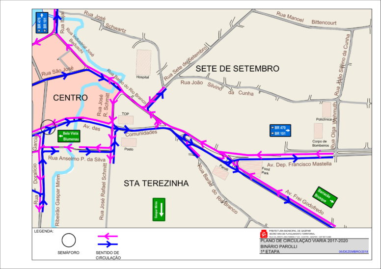 Para melhorar a mobilidade nos bairros e, principalmente, na região central de Gaspar, a Prefeitura está realizando a implantação da primeira etapa do Plano de Circulação Viária de Gaspar. A obra prevê sentido único de tráfego, novas interligações e criação de um binário que irá aumentar a fluidez do tráfego, principalmente em horário de pico.
